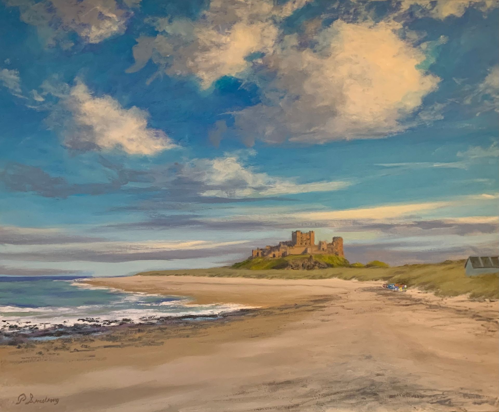 Bamburgh Castle and beach painted on a beautiful sunny day with big clouds rolling in from the sea.