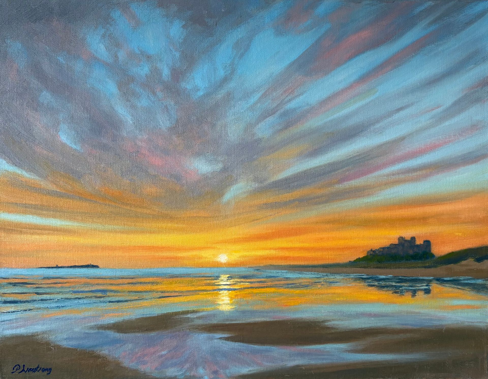 Bamburgh beach and the iconic castle just as the sun rises over the sea originally painted in oils on canvas board from which this limited edition print was made.
