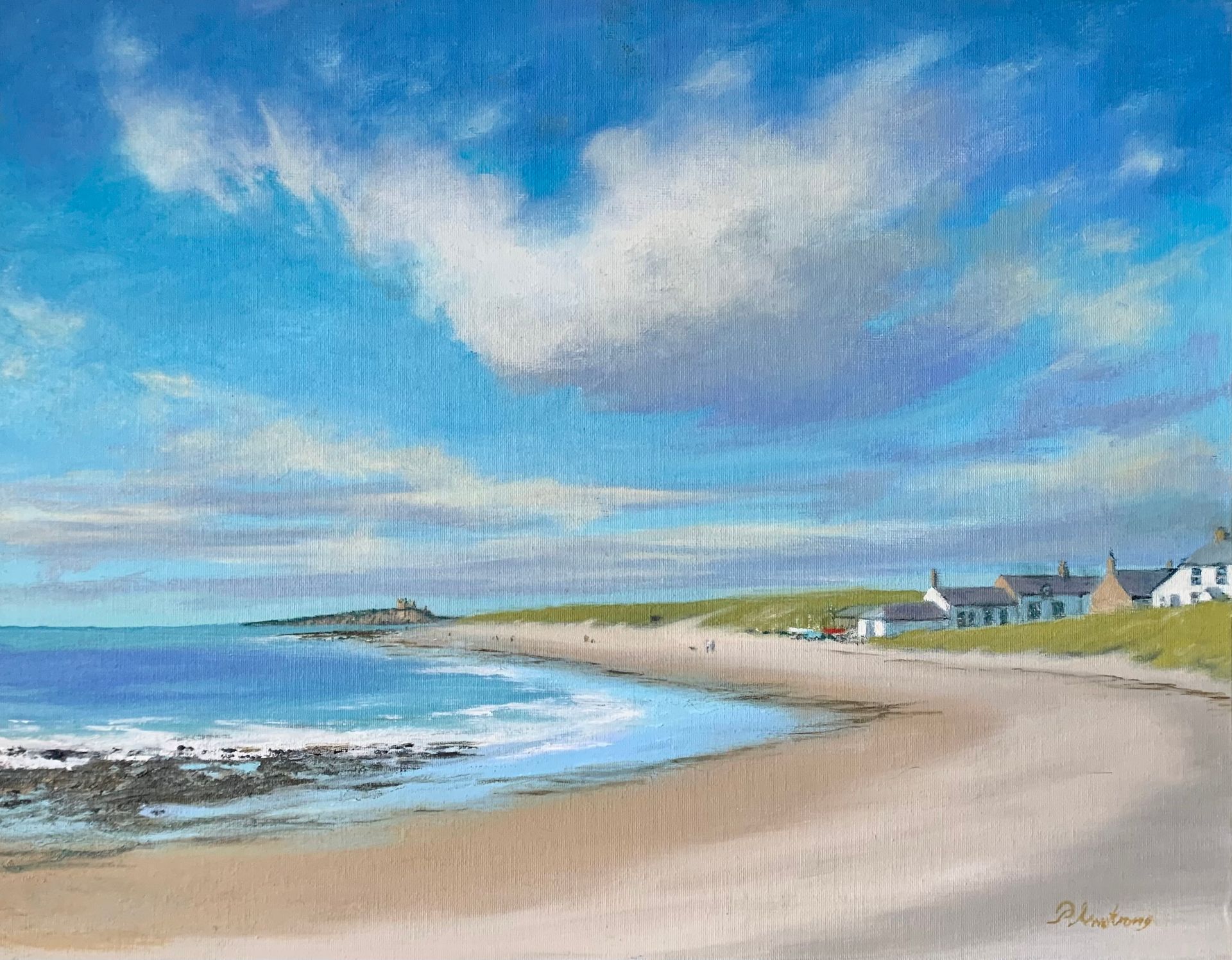 Low Newton beach at high tide with the ruins of Dunstanburgh castle on the long rocky outcrop at the South of Embleton bay.
